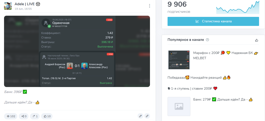 Adele LIVE – это Телеграм-канал, в котором анонимный каппер публикует ставки на настольный теннис в формате марафонов. Проект работает исключительно в Telegram, сайт или профиль на верификационных платформах отсутствует. Каппер активно рекламирует букмекерскую контору MELBET и распространяет промокоды с обещанием бонусов до 9 100 рублей. Мы изучим стратегию прогнозиста и определим, можно ли доверять ставкам от Adele LIVE.