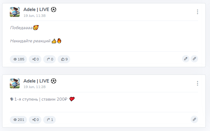 На канале используется стратегия догон, при которой ставка увеличивается после проигрыша. Она считается очень рискованной в беттинге, поскольку при любом минусе крупные суммы уходят в минус. На момент проведения нашей проверки большинство постов в Adele LIVE уже удалены, но личный чат с @adele_vip работает.