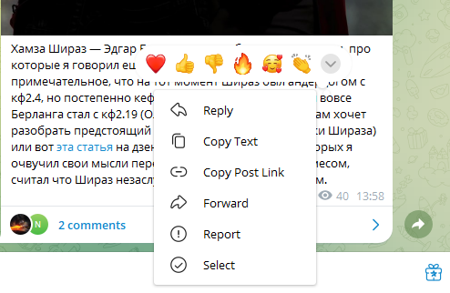 На сторонних ресурсах мы не нашли отзывов на каппера. Это не удивительно, ведь аудитория в телеграмм канале маленькая. При этом каппер не закрывал комментарии, изучая их мы не обнаружили негатива. Также доступна функция оставить реакцию без ограничений на позитивные и негативные смайлики.