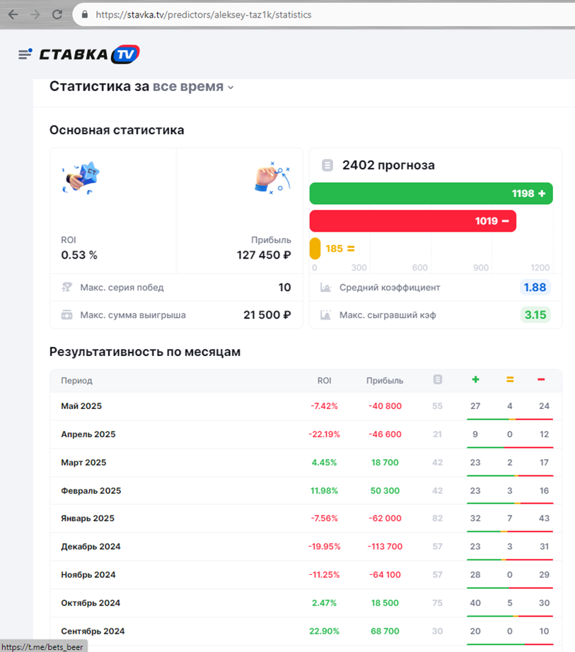 Отзывы о проекте BeerBets: реальная статистика проходимости пари каппера @Taz1k_Beer