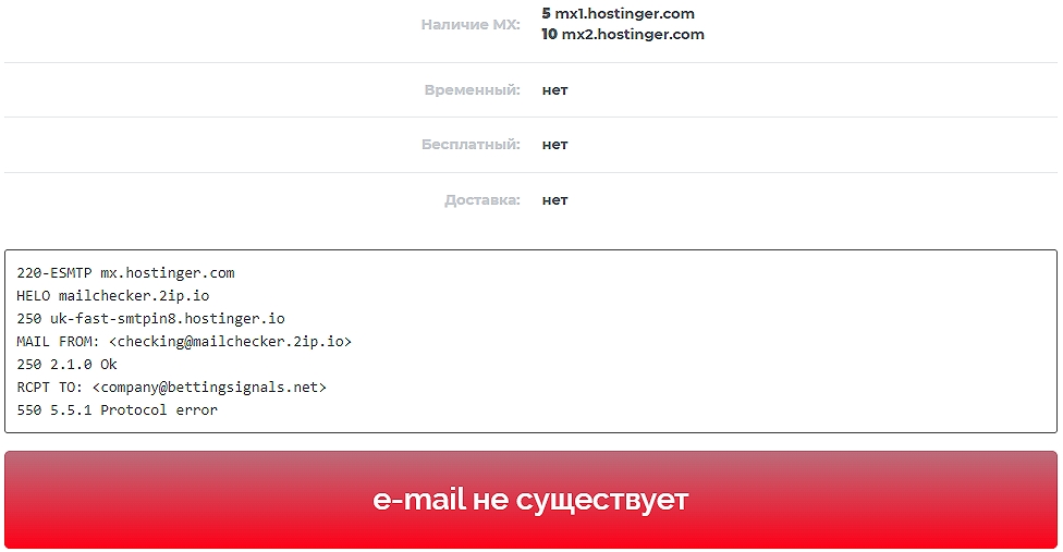 По сервисам верификации не найден и основной e-mail, куда скамер советует обращаться для покупки «топовых подписок». Электронная почта company@bettingsignals net не существует, и здесь админ Betting Signals рассчитывает на развод игрока в «личке» Телеграмма.