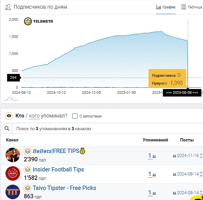 Санкции на @asianbettingsignals также убеждают в непрозрачности сотрудничества, что можно сказать и о трех каналах, где рекламировали данный ресурс. BeBets Free Tips, Insider Football Tips и Taivo Tipster Free Picks можно считать опасными для игроков, ведь их контент в целом повторяет таковой для Betting Signals.