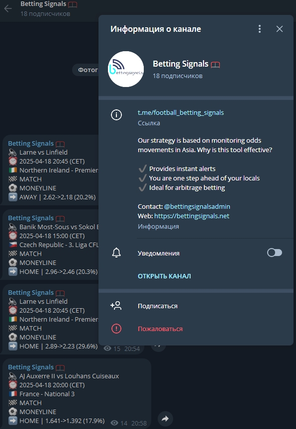 Betting Signals — телеграмм-канал и сайт в Интернете, где игрокам предлагают «мощные» прогнозы на футбол и баскетбол на базе движения коэффициентов. По рассказам основателя @bettingsignalsadmin, для выборки берется «Азия», что идеально для «арбитража ставок» и сбора регулярной прибыли. На деле старый блог @asianbettingsignals заблокирован за нарушение правил Telegram, а специфику нового ресурса-клона разберем в проверке.