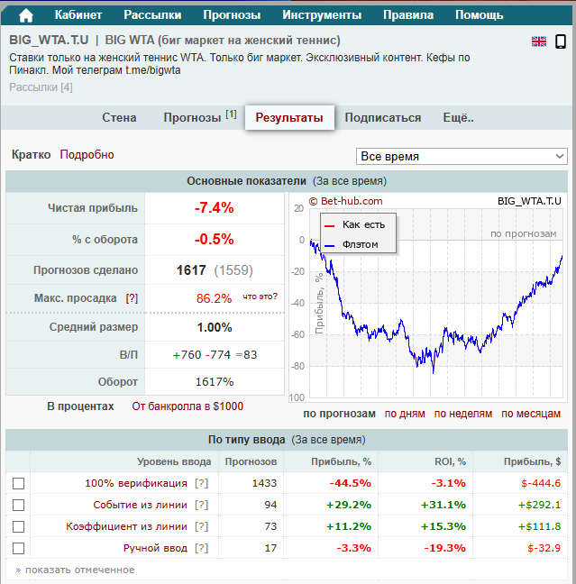 Проект BIG_WTA.T.U ведет честную верификацию прогнозов и с марта 2023 года опубликовал 1617 ставок. По итогам видно, что долгосрочная статистика остается отрицательной: чистая прибыль — минус 7.4%, а максимальная просадка достигла критических 86.2%. Основной убыток приходится на раздел «100% верификация» — минус 44.5% от банка.