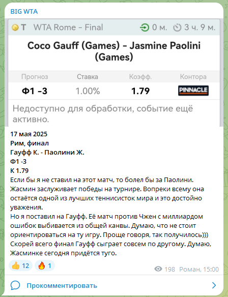 Обзор Телеграм-канала Big WTA со ставками на спорт: отзывы о качестве контента аналитика @Roman_11_77 и перечень его услуг