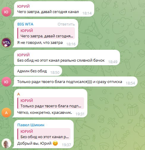 В паблике пользователи поддерживают каппера, несмотря на отрицательные результаты. Большинство отзывов носит лояльный характер и касается честности, а не эффективности. На внешних площадках отзывов о Big Wta практически нет, что объясняется малым числом подписчиков и отсутствием коммерческого продвижения. Игроки не рассматривают проект как источник устойчивой прибыли.