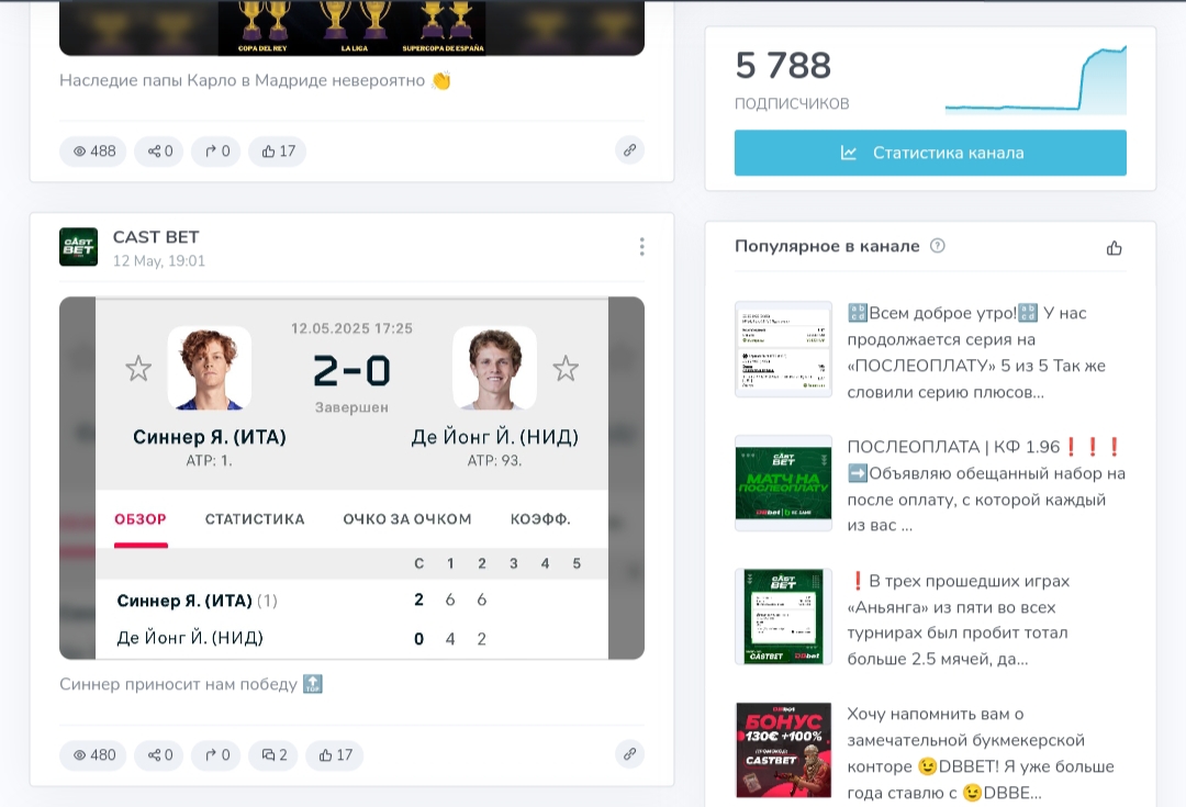 На канал подписано 5,8 тыс. беттеры, только около 7% аудитории поддерживает активность. Значительная часть игроков – фейки, накрученные для создания видимости активности.