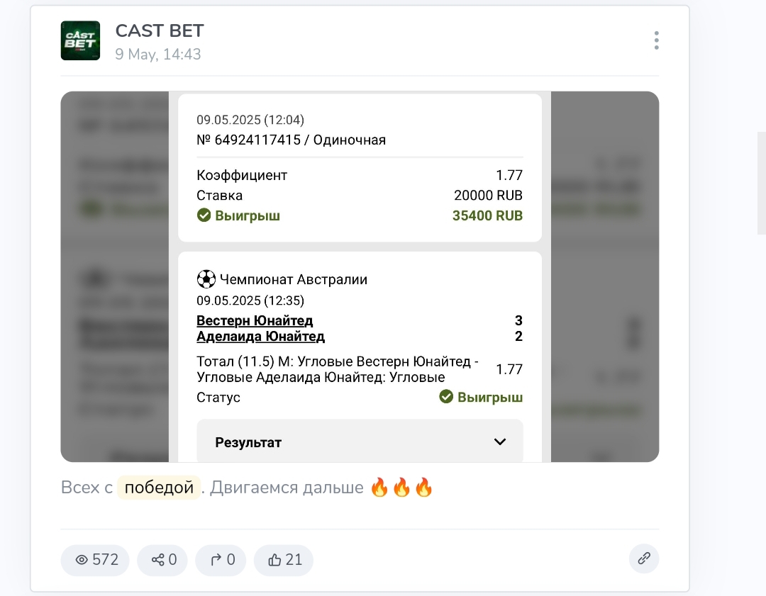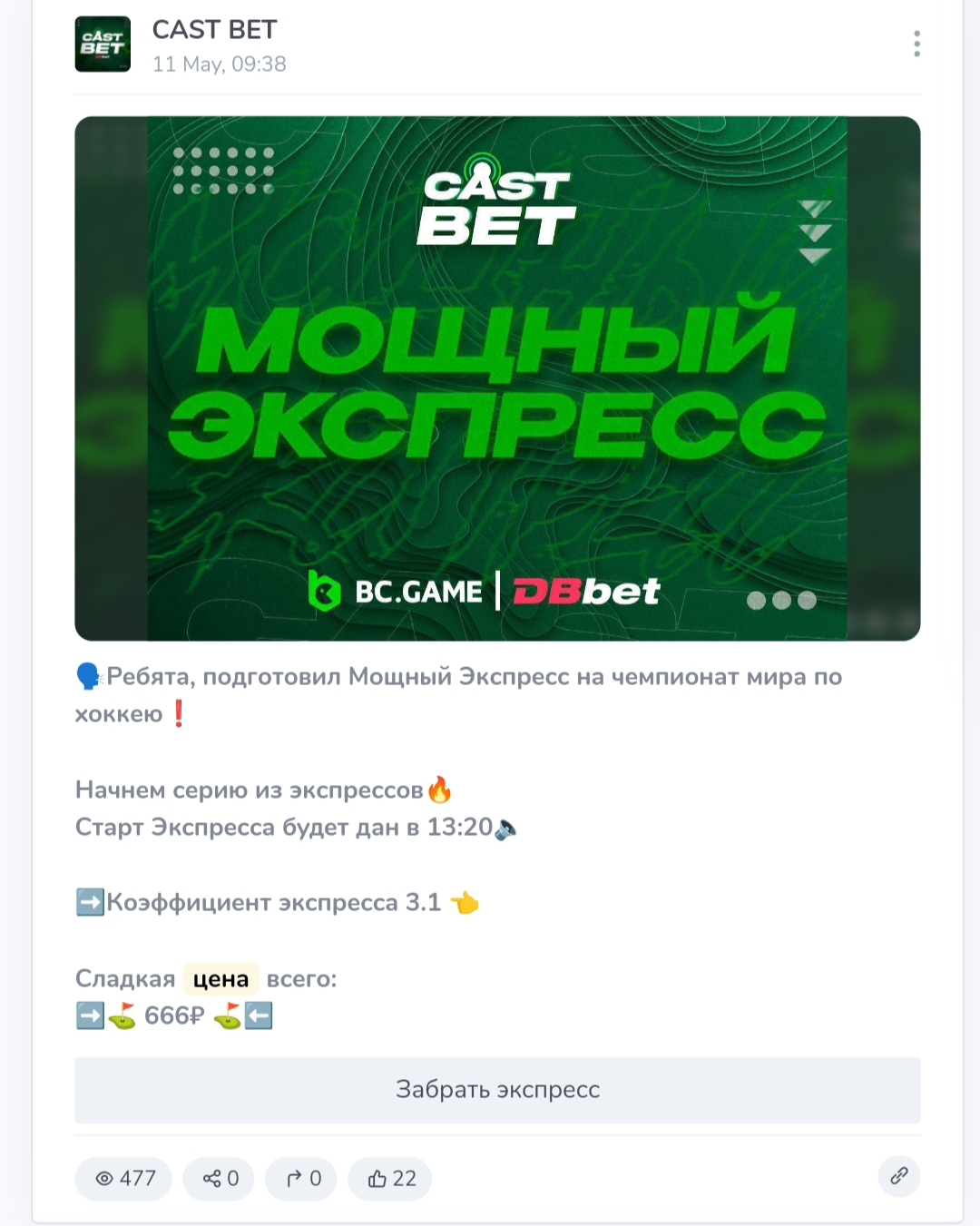 Cast Bets – ТГ канал со ставками на спорт. Аналитик обещает высокую проходимость ставок, честную статистику, надежные платные и бесплатные прогнозы.