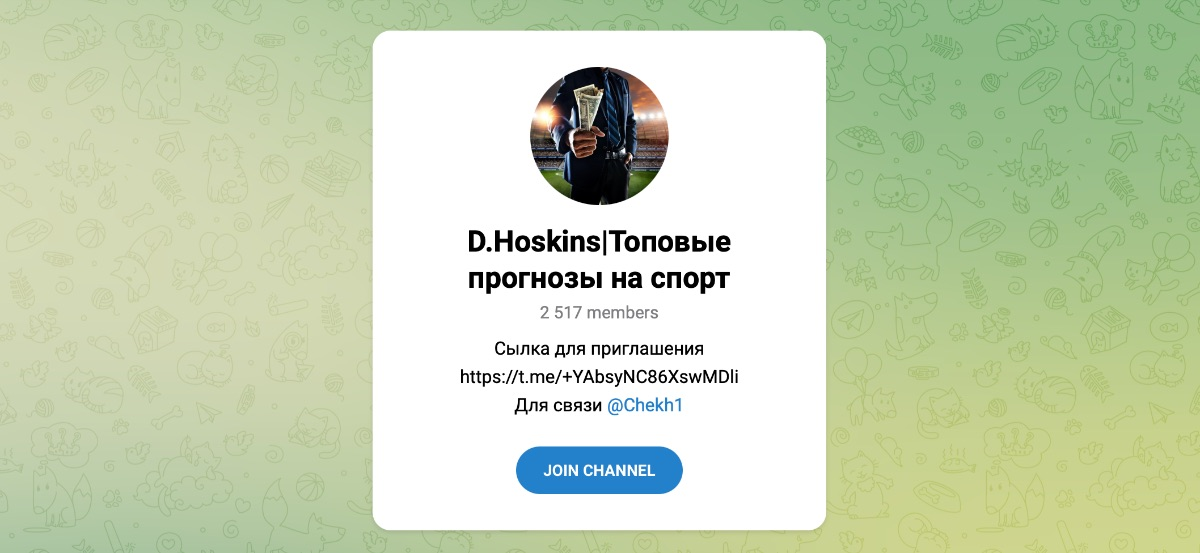 Ресурс D.Hoskins в Telegram — канал, где капер WhaleotDave предлагает прогнозы на спорт, обещая высокую проходимость. Однако репутация прогнозиста и его схемы вызывают подозрения, несмотря на попытки создать видимость надежности.
