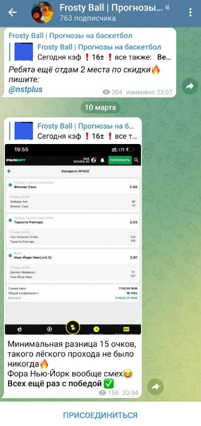 Канал Frosty Ball начал свою работу в 2021 году, но имеет небольшую популярность. Капер ставит только на баскетбол. Четкая специализация является плюсом, потому что показывает серьезный подход к ставкам. В статье расскажем, помогут ли советы из этого канала получить прибыль.