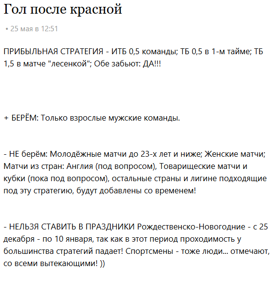 На канале Футбольный лидер продвигается стратегия под названием «Гол после красной», суть которой заключается в ставках на результативность команды, получившей красную карточку в предыдущем матче. Автор предлагает пари на ИТБ 0.5, ТБ 0.5 в первом тайме, общий ТБ 1.5 и «обе забьют», при условии, что коэффициент на победу команды в следующем матче не превышает 3.20. Прогнозист рекомендует избегать женских, молодежных и товарищеских матчей. А еще н не советует применять стратегию в праздничные периоды, ссылаясь на пониженную проходимость в это время.