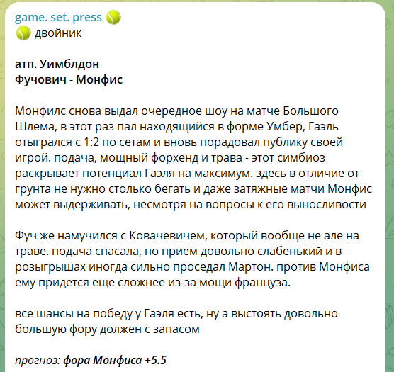 Канал посвящен исключительно теннису, без аналитики других видов спорта, что привлекает узкую аудиторию. Прогнозист gosha_tennis2 предлагает: