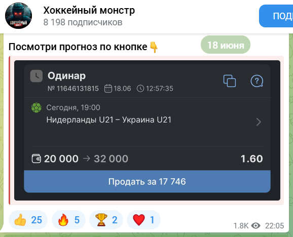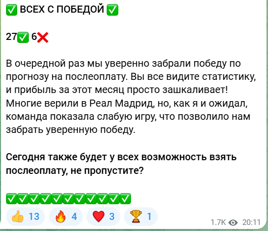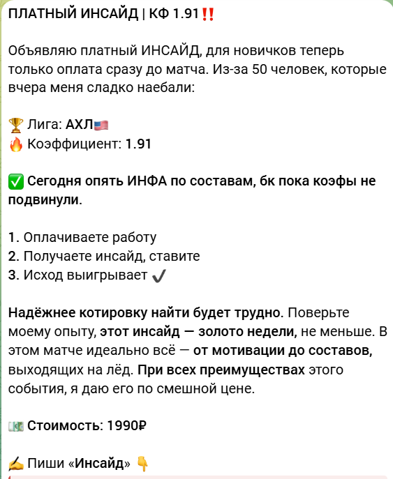 В Telegram публикуются не только бесплатные ставки на спорт, но и платные инсайды, цена – 1990 рублей. Уверенность каппера в победе говорит о желании быстрее продать прогноз. На самом деле высока вероятность слива банка, в таком случае аналитик не вернет деньги.