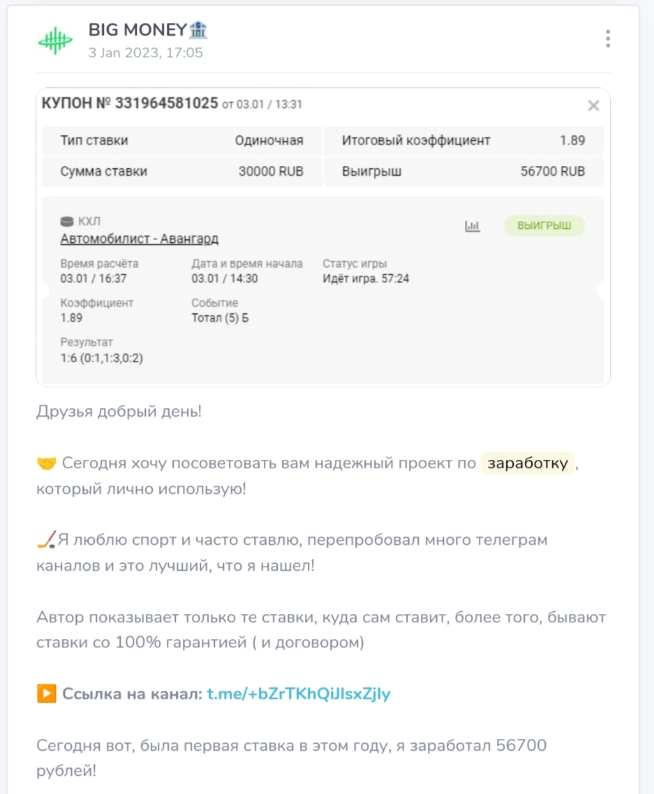 Кроме валюты, админ интересуется ставками на спорт и использует их в качестве инструмента для зарабатывания денег. Он делится Телеграмм каналами со 100%-ной проходимостью и подтверждает выигрыши скринами купонов.