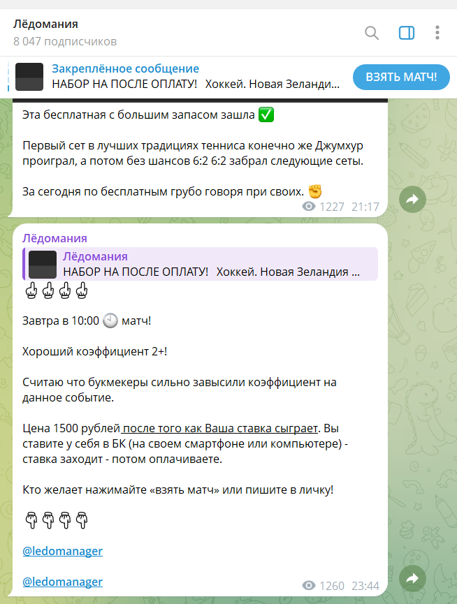 Ledomaniya является пабликом в Телеграмм со спортивной аналитикой. Руководит им некий Ledomanager. Основное его направление – хоккей и теннис. Всем клиентам автор обещает честную и открытую статистику, а также идеальную проходимость ставок.