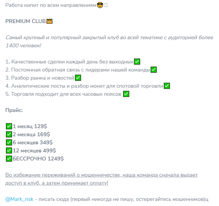 Марк Рисковый публикует контент ежедневно. Основная задача — показать результаты своих торгов и привлечь клиентов на платную основу. Премиум клуб (Випка) стоит не мало. Цены варьируются от 129 до 1 249 долларов за подписку. За эти деньги каппер предлагает следующие услуги.