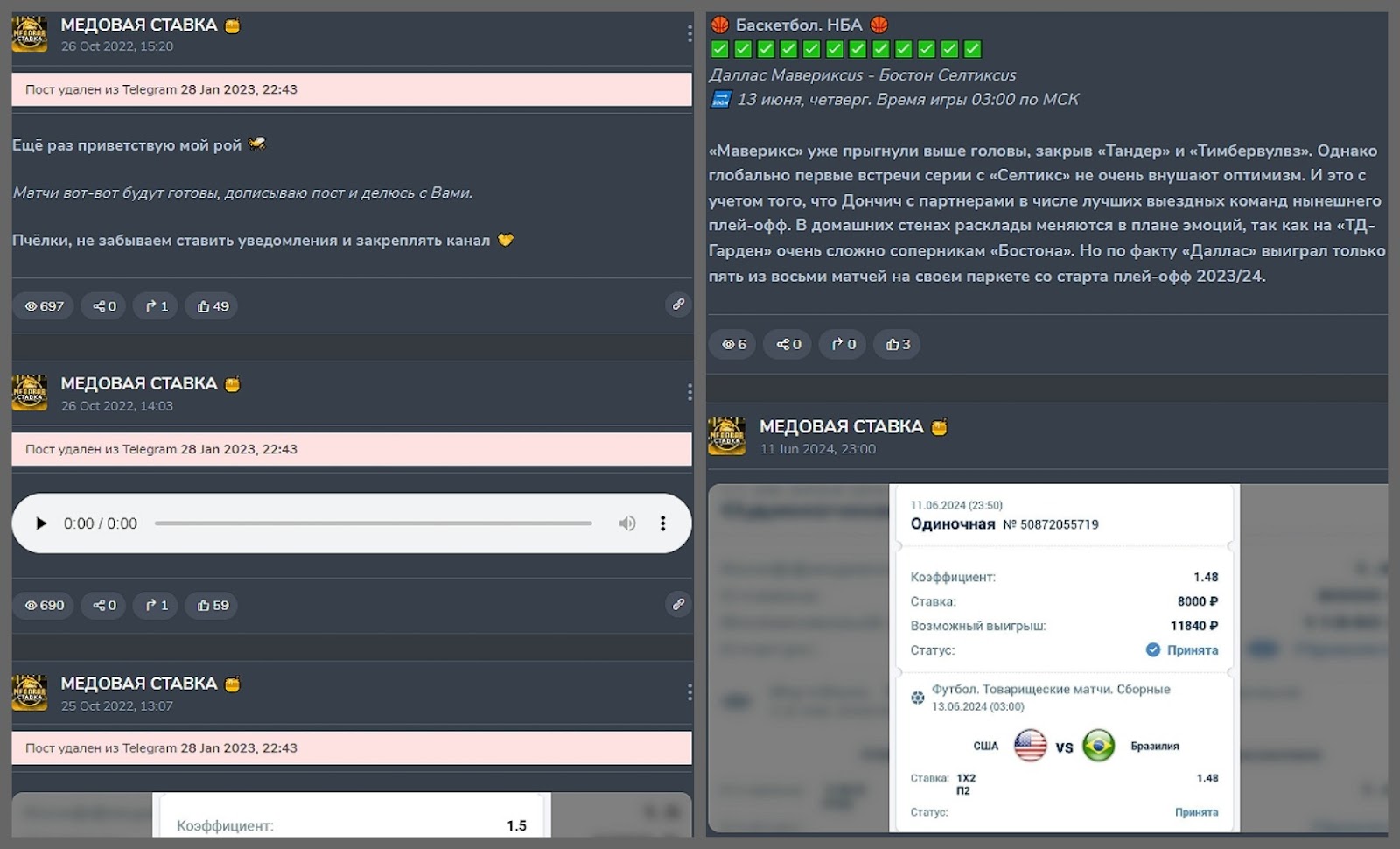 Медовая Ставка — телеграмм-канал, где с октября 2022 по сентябрь 2024 делились бесплатными прогнозами на футбол, хоккей и теннис. Затем публикации приостановили, и последний из админов @jotropa почти год не выходит на связь. Выясним, где пропадает очередной непризнанный «эксперт по предсказанию будущего», и в чем скрытый подвох его активности.
