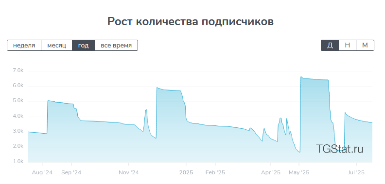 Обратите внимание на количество строго вертикальных линий — например, в мае 2025-го аудитория выросла на 4000 пользователей за один день.