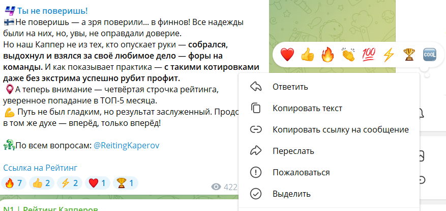 ReitingKaperov создавался для верификации капперов. Проект новый, работает несколько месяцев. С самого начала организовали конкурс капперов с призовыми в виде реальных денег. Таким образом администратор хочет привлечь людей к себе на канал.