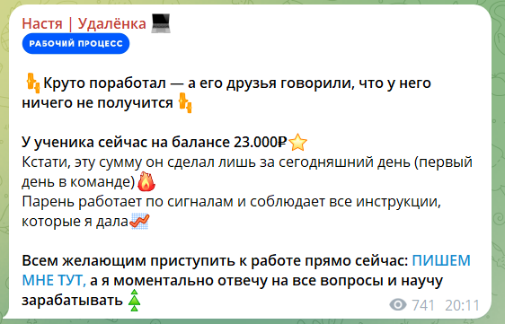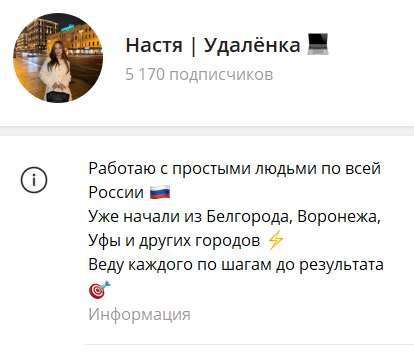 Телеграмм канал Nast udalenka не является капперским. Мы рекомендуем обходить его стороной, так как автор занимается мошенничеством и привлекает людей к сомнительной деятельности. Перед использованием такого контента, обязательно изучайте отзывы и репутацию проекта.