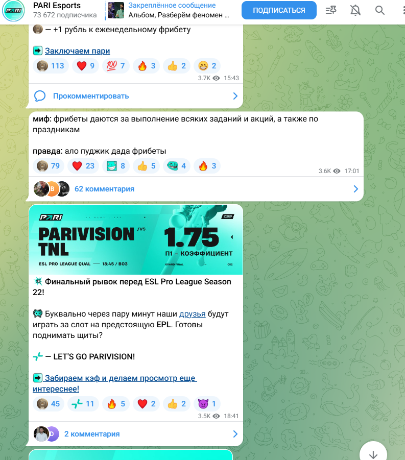 При этом в канале PARI Esports много рекламы букмекерской конторы и других ее проектов. Админ часто разыгрывает фрибеты, а также призывает подписчиков переходить в БК, чтобы получать другие бонусы. Учитывая, что проект принадлежит букмекеру, ничего необычного в его рекламе нет. Но большое количество подобных постов все-таки ухудшает восприятие информации.