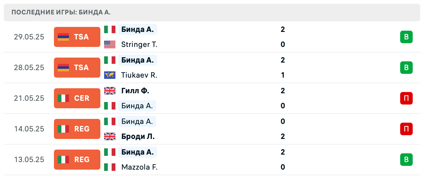 Александр Бинда уверенно проходит по турнирной сетке ITF M15 Tsaghkadzor. В последних двух матчах он обыграл Stringer T. (2:0) и Tiukaev R. (2:1), продемонстрировав уверенную игру и хорошую физическую готовность. Несмотря на два поражения в мае (от Гилла и Броди), Бинда сумел восстановить форму и показывает высокий уровень на данном турнире.
