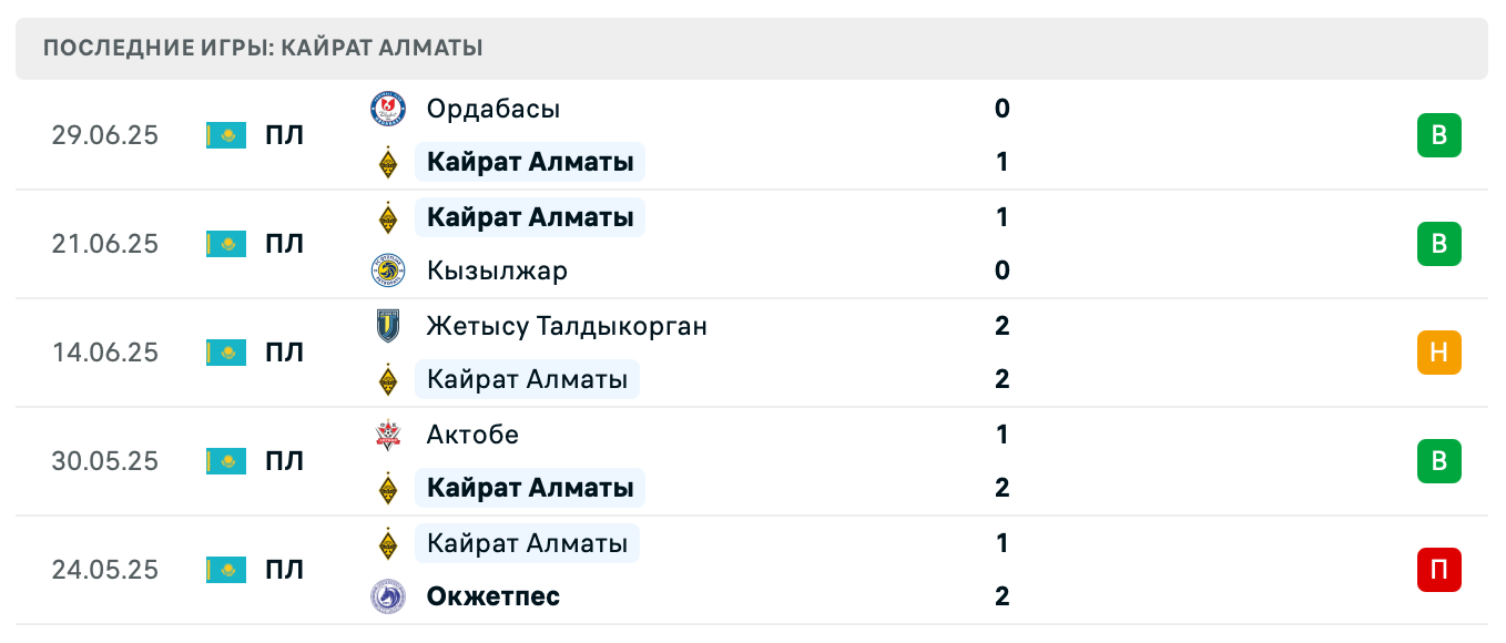 Кайрат Алматы в хорошей форме — три победы в последних пяти матчах. Команда одолела Ордабасы (1:0), Кызылжар (1:0), а также Актобе на выезде (2:1). Единственное поражение — от Окжетпеса (1:2), но оно было скорее случайностью. Команда демонстрирует зрелую игру, хорошо выстроенную оборону и грамотное распределение нагрузки в атаке.