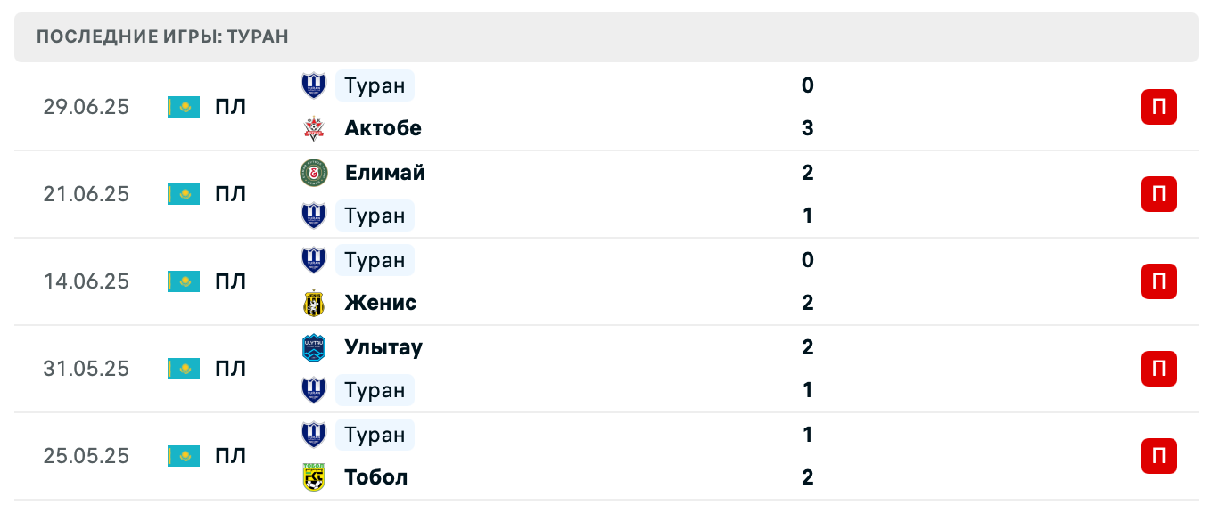 Туран пребывает в кризисе — пять поражений подряд с общим счётом 3:11. Команда уступила Актобе (0:3), Женису (0:2), Улытау (1:2) и другим. Проблемы прослеживаются во всех линиях: слабая реализация моментов, частые позиционные провалы в защите и недостаток игровой дисциплины.