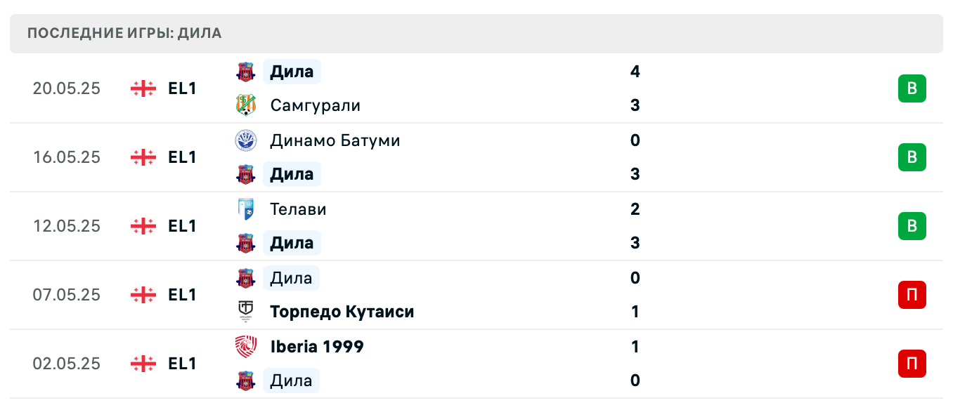 Дила в пяти последних поединках добыла три победы и два поражения. Коллектив забил 10 мячей и пропустил 7 (2,0 — 1,4 за игру). После уверенных гостевых викторий (3:0 над Динамо Батуми, 3:2 над Телави) последовали домашние крупные победы (4:3 над Самгурали) и лишь две неудачи против Торпедо и Иберии.