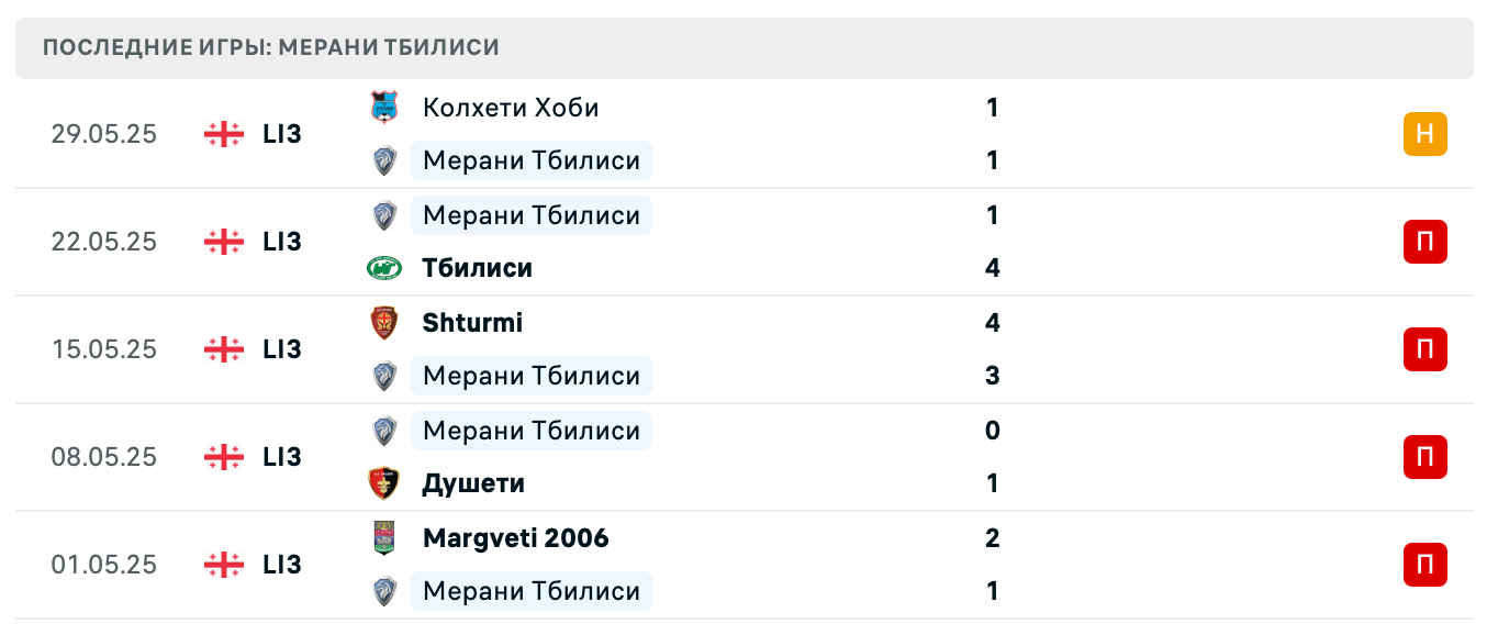 - 22.05.25: Мерани Тбилиси – Тбилиси 1:4 (П)