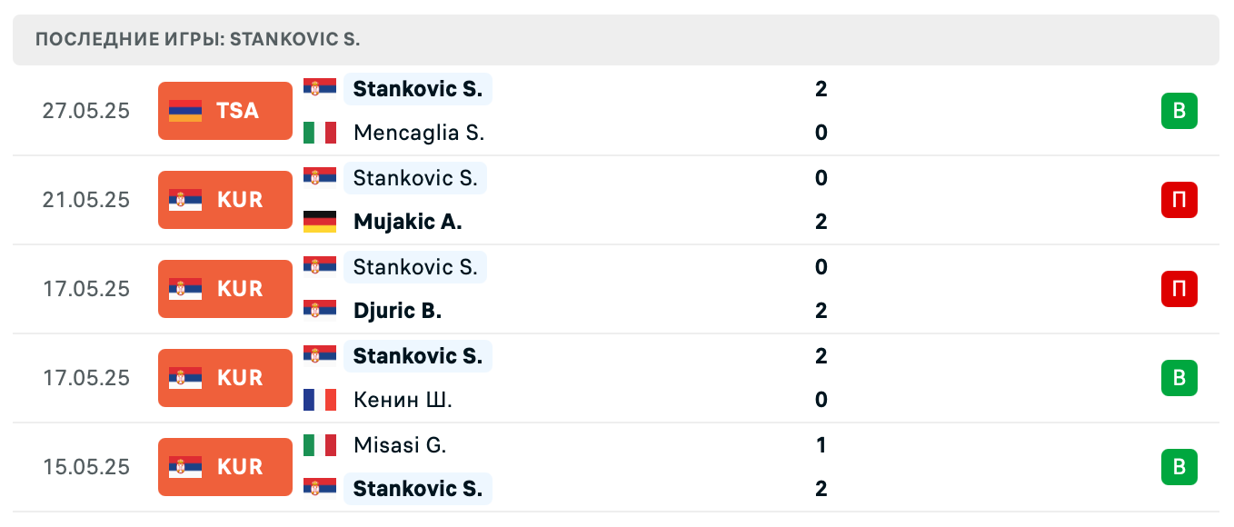 Симеон Станкович демонстрирует нестабильную, но потенциально опасную игру. Его последние победы были добыты в двухсетовых матчах, что говорит о хорошей стартовой концентрации. Однако два поражения всухую указывают на проблемы с адаптацией к разному стилю игры соперников.