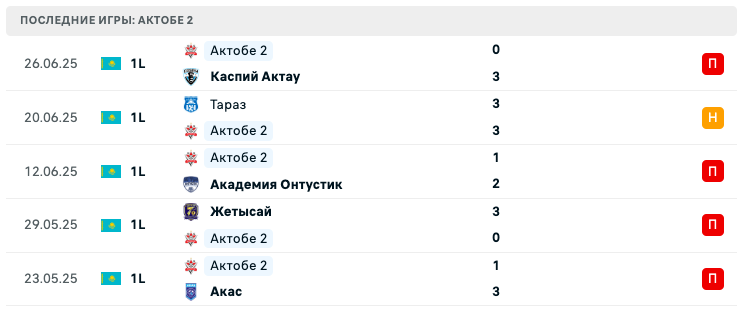 - 26.06.25: Актобе 2 – Каспий Актау (0:3)