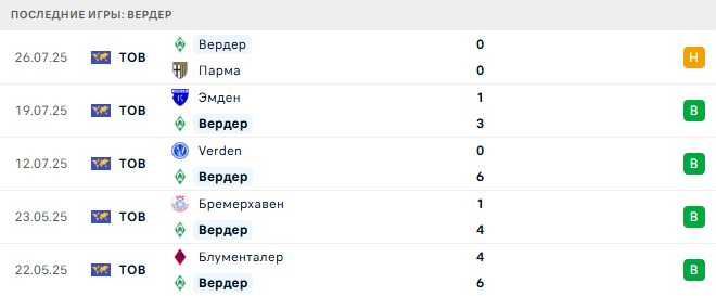 Вердер подошёл к игре после серии матчей на турнире в Циллертале — ничья с Пармой (0:0) и уверенные победы над Киккерс Эмден (3:1), Верденом (6:0), Бременхавеном (4:1), Блументхалем (6:4). Форма выглядит убедительно: четыре победы и одна ничья, всего 19 голов за пять встреч, средний показатель 3,8 гола за игру.