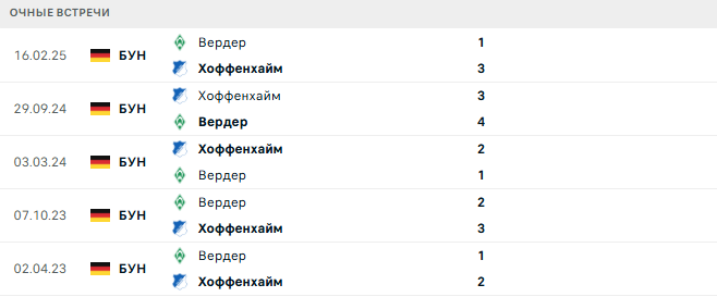 В пяти последних очных встречах Хоффенхайм выиграл четыре, Вердер — одну, при этом ни одного ничейного результата. В феврале 2025 года Хоффенхайм обыграл Вердер 3:1.