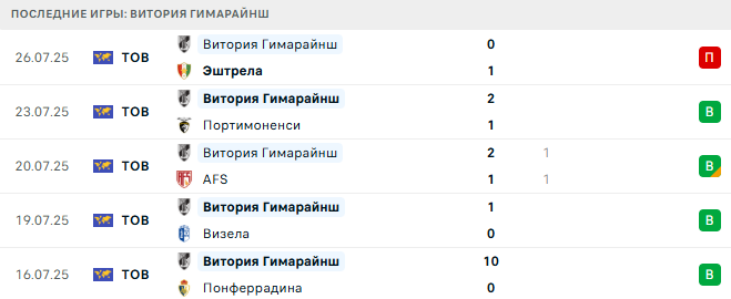 Витория показала убедительную форму в предсезонке: победы над Понферрадиной (10:0), Визелой (1:0), Портимоненсе (2:1) при одном поражении от Эштрелы (0:1). В среднем команда забивает около 3,2 гола за матч, что говорит о яркой атакующей установке.
