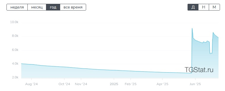 Телеграм-канал PR TENNIS существует с 2020 года, в июле 2025-го на него подписано 7800 пользователей. Но в конце мая была произведена очевидная накрутка с показателя, равного 2700 человек, — обратите внимание на строго вертикальный отрезок графика.