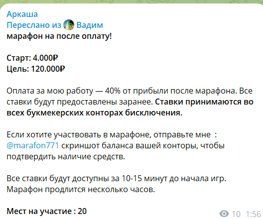 Канал Прогруз 1 в telegram — это закрытый телеграм-блог, сейчас известный как Аркаша. Его ведет прогнозист Павел (@paveldivnov), который предлагает ставки на спортивные матчи, проводит марафоны и продает доступ в вип чат. Несмотря на активную рекламу в смежных каналах, структура проекта вызывает сомнения. Проведя проверку, мы обнаружили признаки непрозрачной схемы с возможными элементами развода.