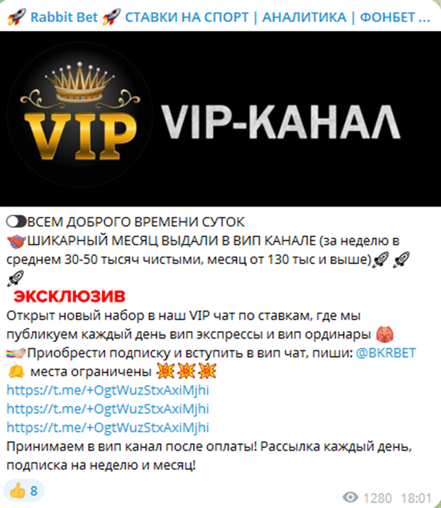 У проекта Rabbit Bet есть платный клуб, в котором якобы публикуются советы с высокой проходимостью. Однако сколько именно и какие пари получают клиенты нигде не указано. От подписчиков скрывают и стоимость вступления в вип-чат, что вызывает подозрения в обмане со стороны автора.