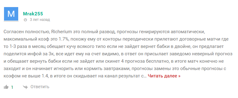 Richerium не является качественным аналитическим проектом. Это схема, где проигрыши игроков являются основным источником дохода. Для работы стоит выбирать такого специалиста, который ведет открытую и верифицированную статистику, публикует обоснованные прогнозы и не требует регистрации в сомнительных БК через реферальные ссылки.