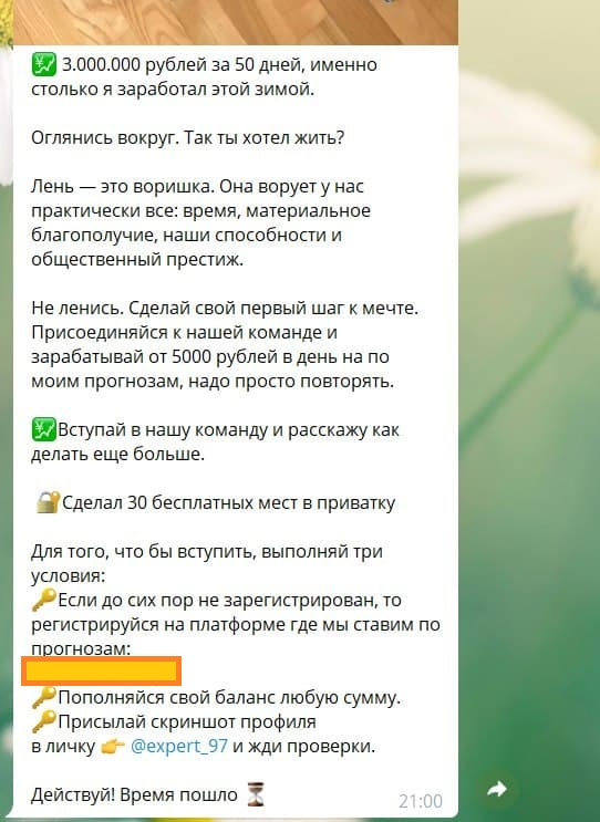 Прогнозы действительно предоставляются бесплатно, однако это часть схемы. Вместо прямой оплаты аналитик требует регистрации в букмекерской конторе через его партнерскую ссылку и пополнения депозита. Таким образом, доход он получает не за счет успешности прогнозов, а за счет проигрышей привлеченных игроков. VIP-подписок нет, но доступ к «закрытым прогнозам» предоставляется только после выполнения вышеуказанных условий.