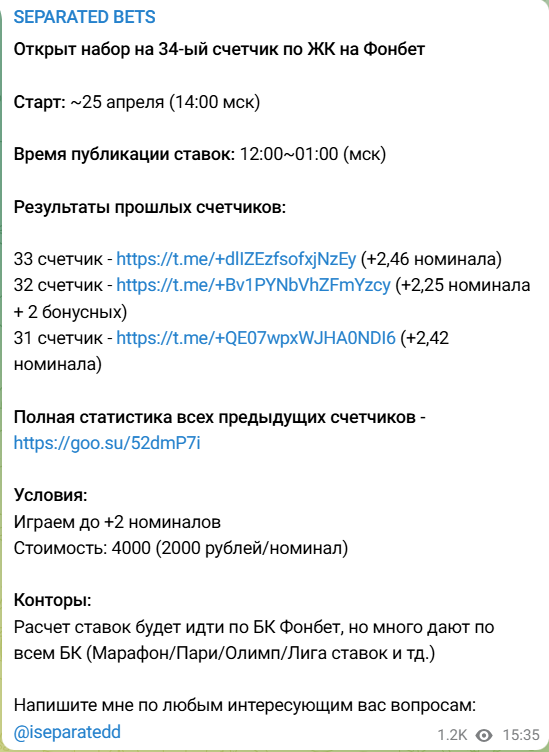 Каппер Iseparatedd ведет Телеграмм, где предлагает прогнозы в лайве. Он специализируется на исходах, которые недооценил букмекер, что является достаточно сложной стратегией, требующей опыт, умение проводить глубокий анализ предыдущих и текущих матчей. Прогнозист показывает, что у него есть знания и навыки для рискованных ставок с высокой проходимостью.
