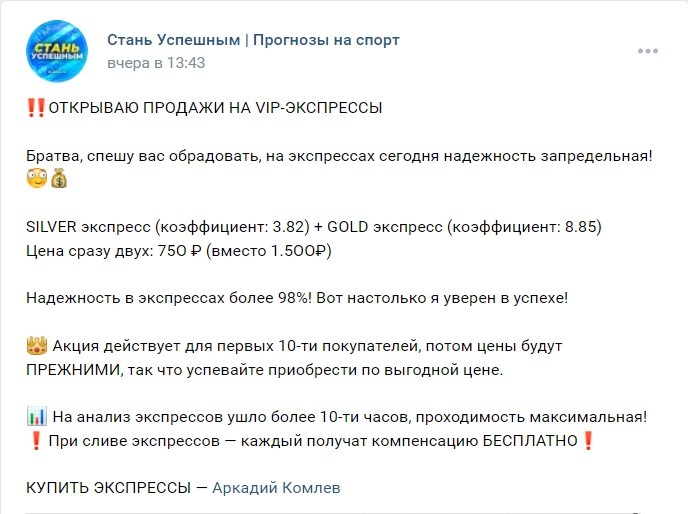 Проект "Стань Успешным | Прогнозы на спорт" и капер Аркадий Комлев не выглядят надежными. Накрученная аудитория, отсутствие прозрачных отчетов, фейковые скрины, агрессивная модерация и ложные гарантии — все это признаки мошеннической схемы.