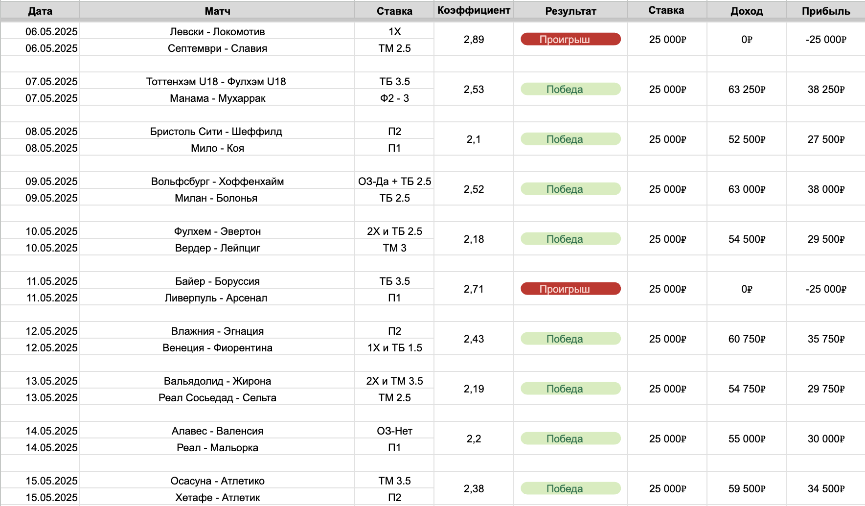 Первую проверку мы провели в мае 2025 года. Взяли самый простой тариф на ставку дня (15 прогнозов), чтобы понять, действительно ли каппер разбирается в своём деле и насколько качественный у него анализ. Из 15 купленных двойников 13 оказались выигрышными, а 2 проигрышными. Ниже вы можете посмотреть наши результаты и убедиться в этом сами: