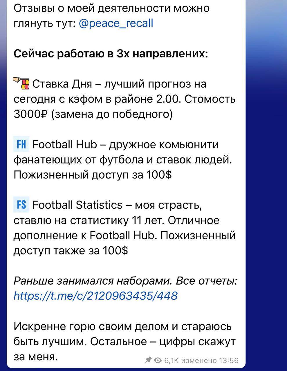 Каждый день автор старается выдавать по одному бесплатному прогнозу. Он разбавляет контент новостными сообщениями, своими мыслями по предстоящим событиям. На платной основе предлагаются 2 подписки и штучные прогнозы.