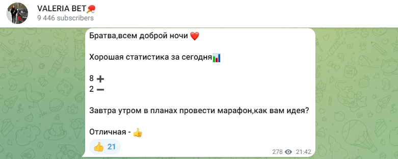 Отзывы о работе Telegram канала Valeria Bet: проходимость прогнозов аналитика Валерии