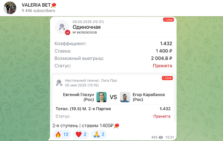 В 2024 году был создан каперский ресурс в Телеграмме Valeria Bet. Его ведет прогнозист Валерия, но за этим именем может скрываться другой человек. Девушка работает со ставками на один вид спорта — настольный теннис. Она каждый день публикует бесплатные прогнозы. Реклама БК вызывает подозрение в мошенничестве. Также на проекте присутствуют платные предложения: покупка одиночных прогнозов и вступление в вип чат. Мы провели проверку, чтобы определить уровень качества прогнозов аналитика.