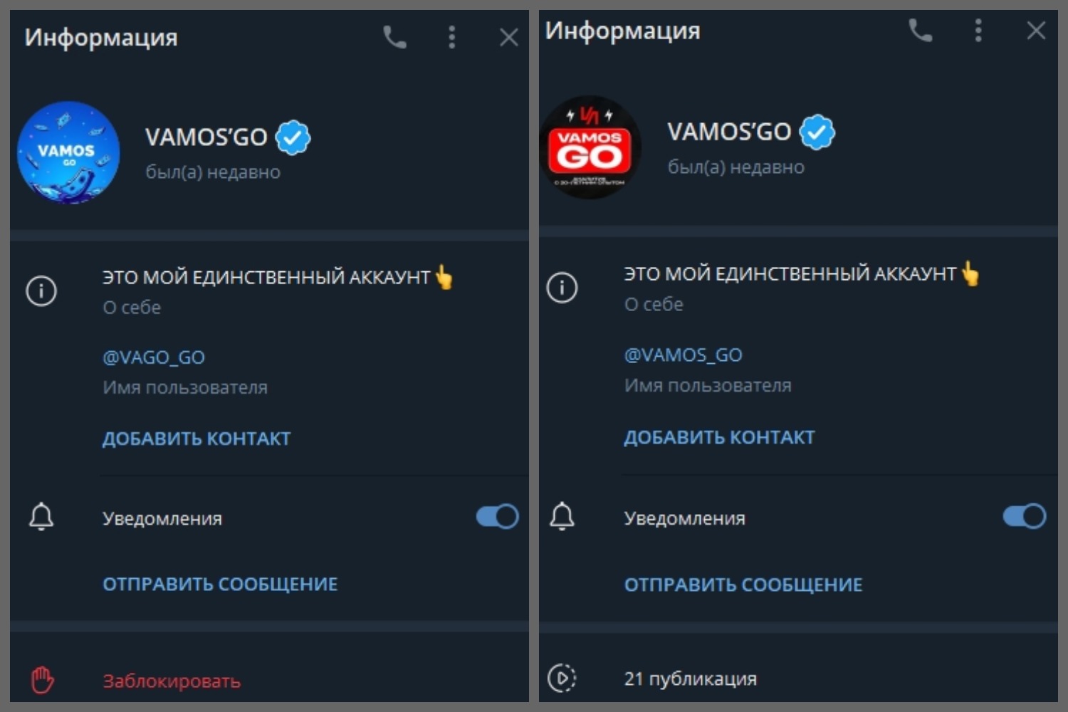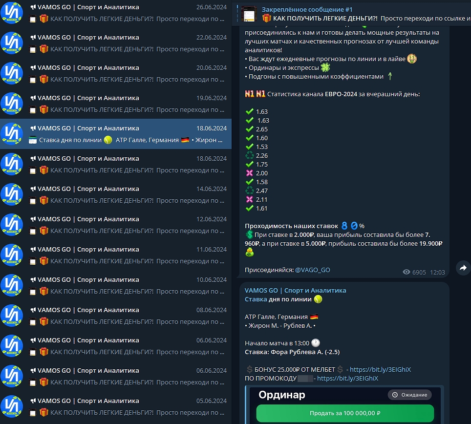 Обман очередной «гуру ставок» начинает немедленно, говоря подписчикам о наличии у него «одного аккаунта». Под псевдонимом @VAGO_GO тот предпочитает разводить в главном телеграмм-канале @vagogo_official, но у него есть и дублер с периодически меняющимися адресами.