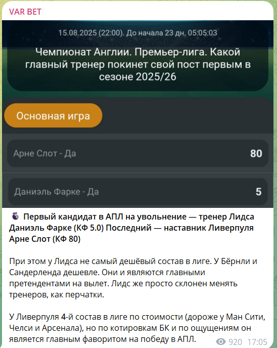 Var Bet — типичный телеграмм-проект, имитирующий честного каппера, но на деле вызывающий множество сомнений. За каналом стоит анонимный автор @varbet10, который не раскрывает личность, не публикует внятной статистики и активно использует рекламу букмекерской конторы. Активность подписчиков не соответствует их количеству, возможна накрутка. Ни о каком доверии к проекту речи не идет — перед нами классическая схема монетизации чужих проигрышей.