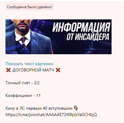 Платных подписок в White Bet нет, основной акцент на «рекомендации» БК. После перехода по реферальной ссылке, пользователь получает бонус, а каппер — процент с проигрыша. Alina Brown регулярно публикует сомнительную рекламу других мошеннических сообществ, где предлагают договорные матчи с точным счетом или экспрессы с кэфом 100+.