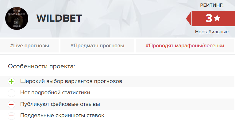 Возможно из-за мошеннической деятельности сейчас телеграмм канал Вилдбет и не работает. Однако утверждать этого мы не можем. А можем сказать, что сотрудничать с подобными проектами мы не рекомендуем. Надежный каппер всегда верифицирует свои результаты и не боится получать объективную обратную связь.